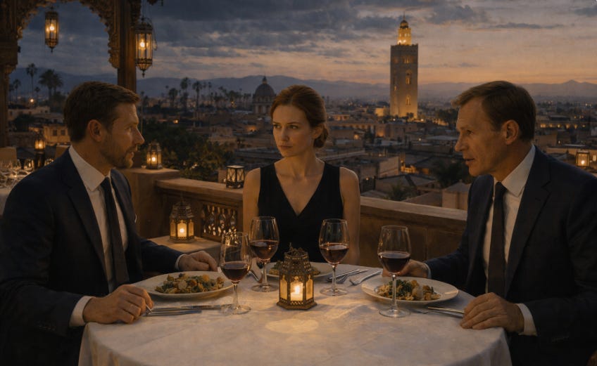 Il vapore che si sprigionò quando il cameriere scoperchiò il tajine, carico di zafferano e cannella, avvolse il viso di Anna come un velo orientale. I suoi capelli, dopo una giornata alla spa, rilasciavano un tenue profumo di gelsomino che contrastava con gli aromi speziati delle pietanze.