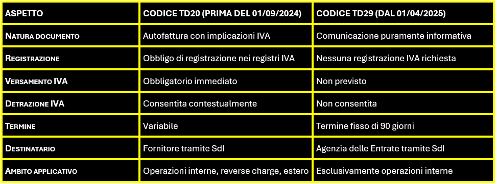 Questa riorganizzazione dei codici consente di distinguere nettamente la finalità sanzionatoria e comunicativa del TD29 da quella strettamente IVA del TD20, razionalizzando la gestione documentale e favorendo maggiore chiarezza operativa per contribuenti e professionisti.
