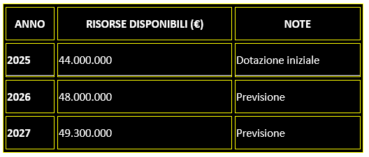 Il decreto stabilisce una dotazione complessiva di circa 141 milioni di euro per il triennio 2025–2027, distribuiti su tre annualità (circa 44 mln nel 2025, 48 mln nel 2026 e 49,3 mln nel 2027).